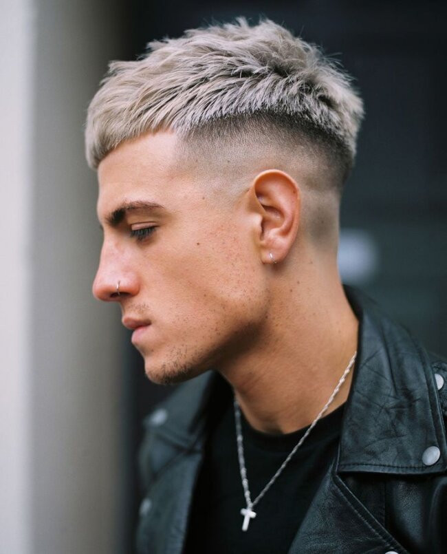 The platinum crop is one of the cleanest, most modern blonde hairstyles for men. The icy color automatically adds sharpness, making even thin hair look thicker because of the high contrast. A textured crop works especially well because the short, choppy layers break up the solid platinum tone and keep the haircut looking rugged rather than “too perfect.”