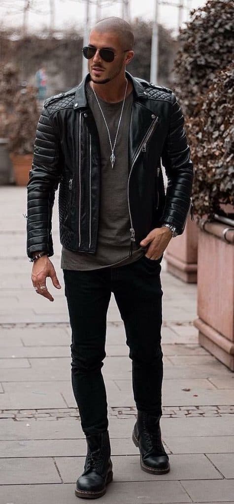 Black biker jacket, gray tee, dark jeans, Chelsea boots.