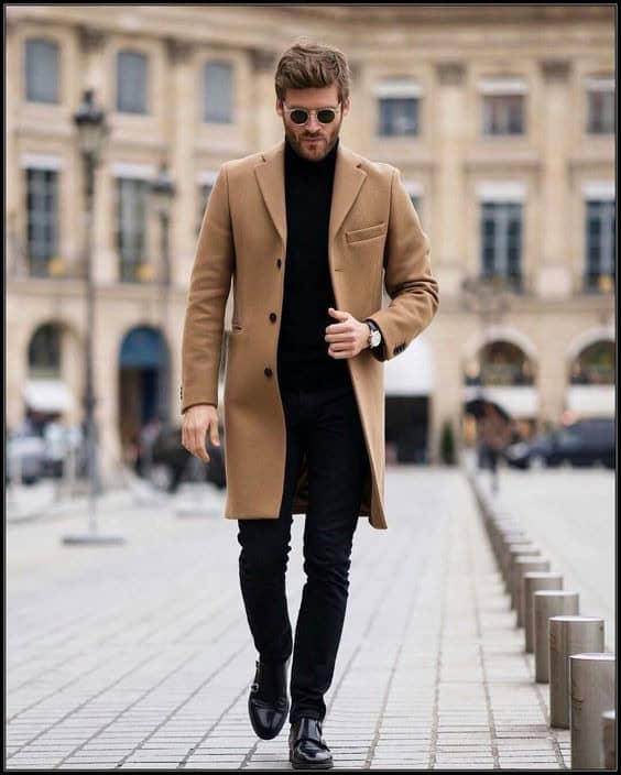 Beige trench, turtleneck, black trousers, dress boots.