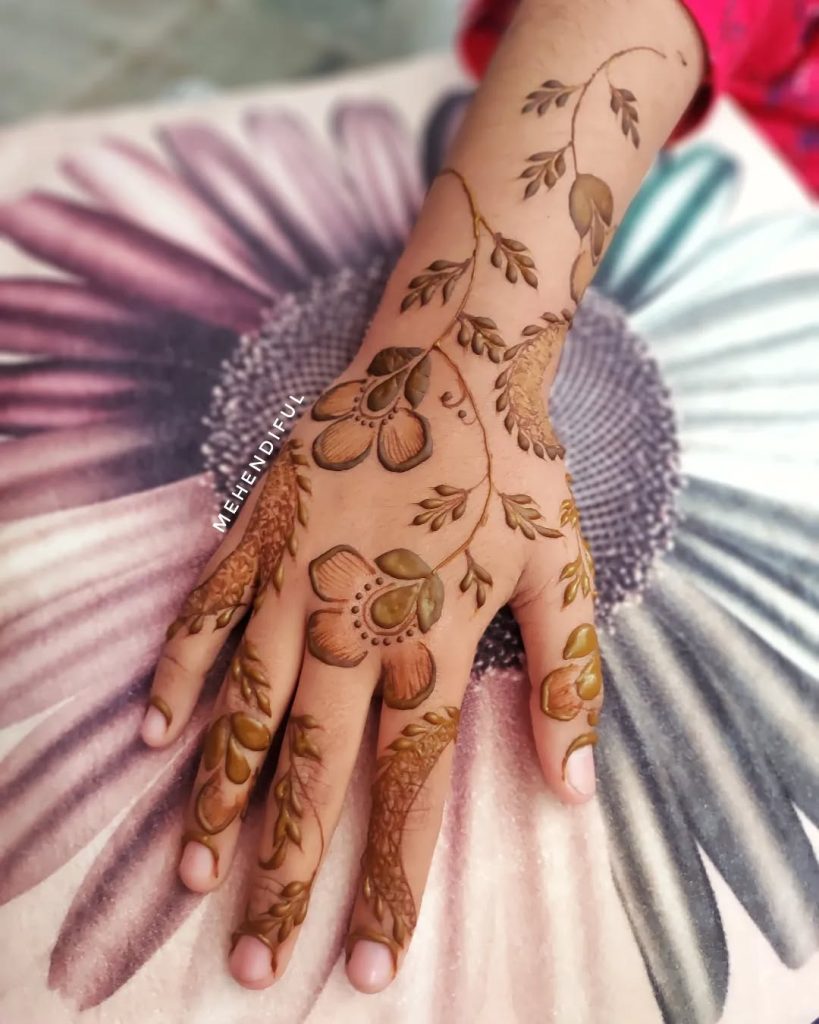 Arabic henna is perfect if you want something bold yet airy. Instead of filling every space, it uses large flowers, leaves, and vines that flow diagonally across the hand.