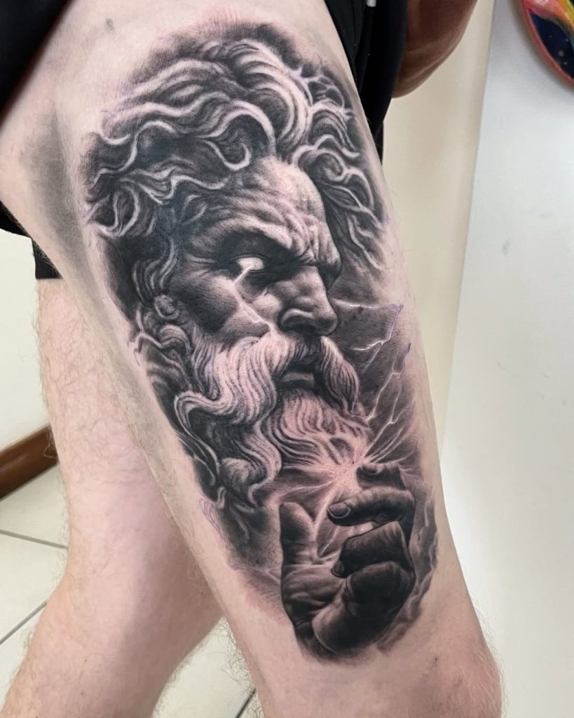Thigh tattoos are getting huge among men right now because they’re versatile, masculine, low-maintenance, and surprisingly less painful compared to ribs, shins, or sternum pieces.