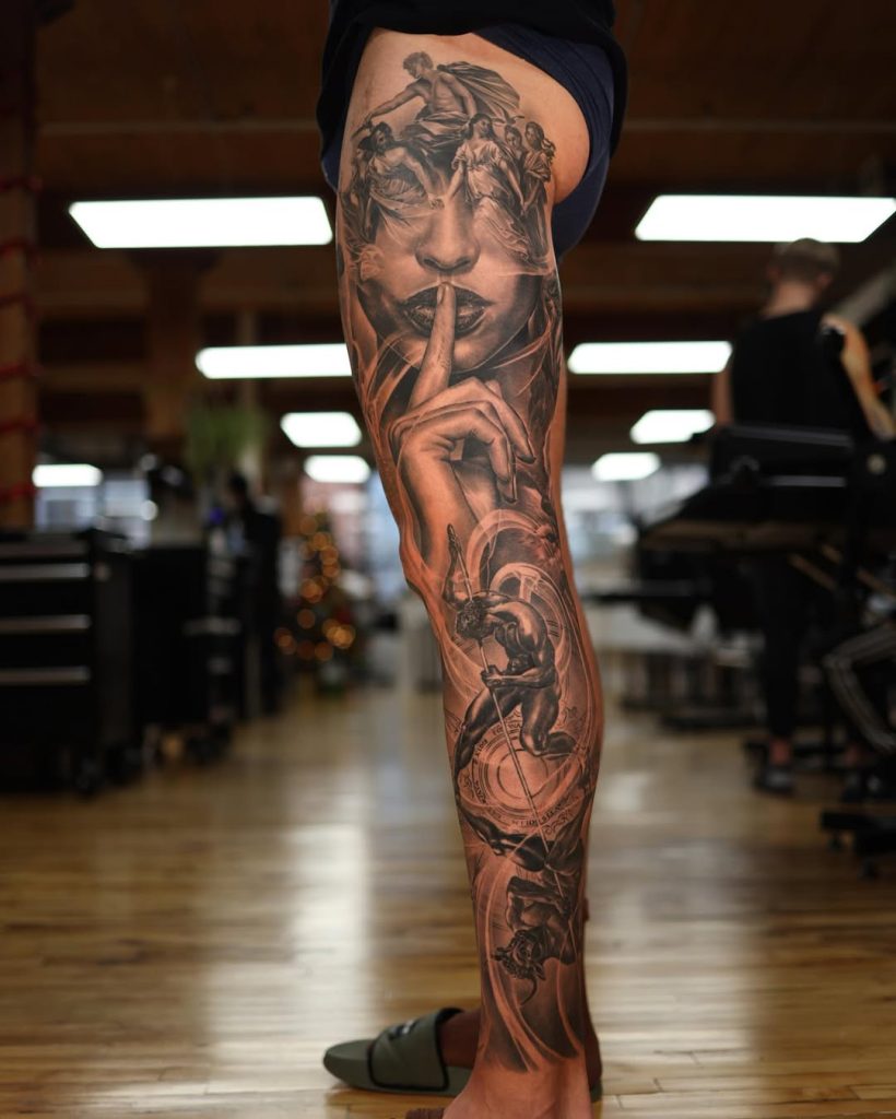If you eventually want a full leg sleeve, the thigh is where most people start.